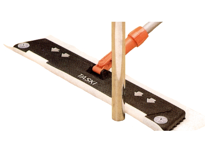 Attrezzatura per la scopatura a umido con un pratico sistema a garze monouso o panni Taski Flortex riutilizzabili.