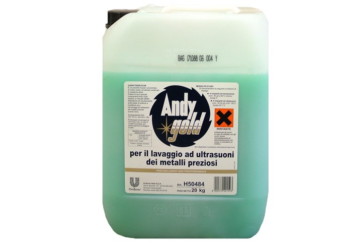 Andy Gold è il detergente appositamente studiato per l'impiego nella lavorazione dei metalli preziosi; il suo utilizzo è particolarmente indicato per la pulizia di oro, argento, ecc.