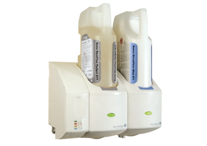 Il Suma Revoflow consente di diluire nella lavastoviglie un prodotto concentrato per lavaggi generali o specifico per alluminio (lavapentole). Il dosatore è dotato di una sonda conduttimetrica che richiama il detergente solamente in caso di bisogno e questo evita sovradosaggi o sottodosaggi, mentre il brillantante viene diluito ad ogni risciacquo con una pompa peristaltica.