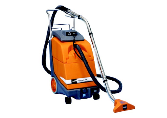 Macchina carrellata per pulizia moquette ad acqua con metodo iniezione-estrazione. Peso Kg.24, 2 serbatoi da Lt.22, iniettore importante da cm.30 e portata d'acqua regolabile.