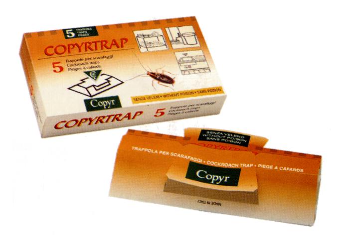 Copyrtrap Prezzo base: SKU: 4C50 4C50 Copyrtrap per scarafaggi Torna a: Prodotti per disinfestazione Fai una domanda su questo prodotto Descrizione Trappola a strato collante con pastiglia attraente, efficacie per ogni tipo di scarafaggio. Scatola da pz.5
