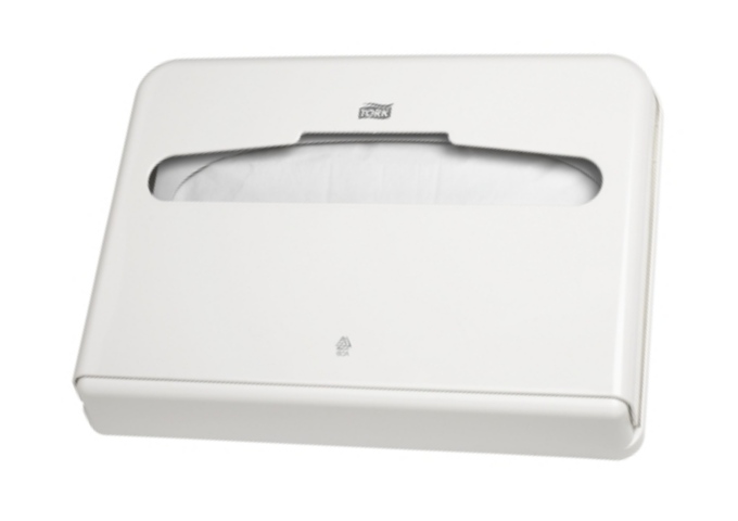 Dispenser per veline copriwater, in materiale plastico di colore bianco.