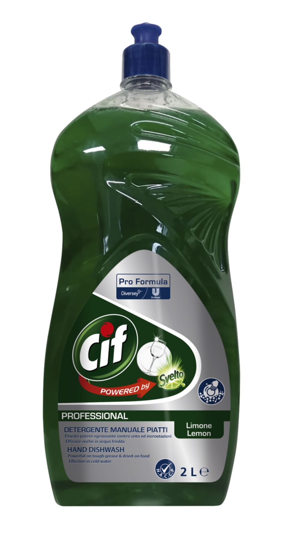 Cif Manuale Piatti Professionale è il detergente liquido concentrato per il lavaggio manuale di stoviglie, pentole, vasellame, bicchieri e di tutti gli utensili lavabili della cucina.