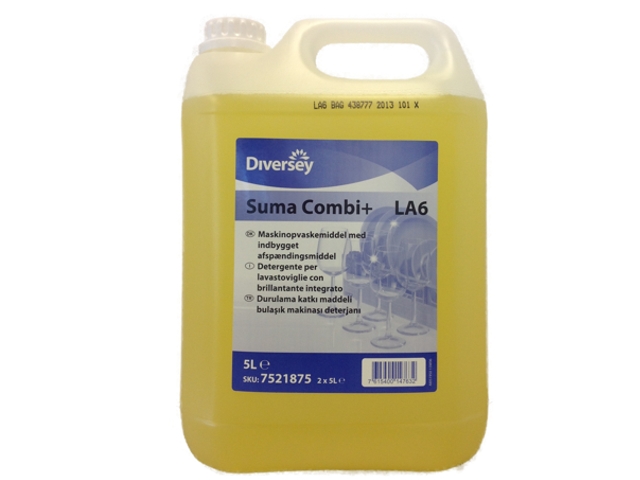 Suma Combi+ LA6 è un liquido concentrato per il lavaggio meccanico delle stoviglie che utilizza una tecnologia innovativa in grado di combinare il detergente e il brillantante in un unico prodotto. E' specificatamente formulato per assicurare uníottima rimozione dello