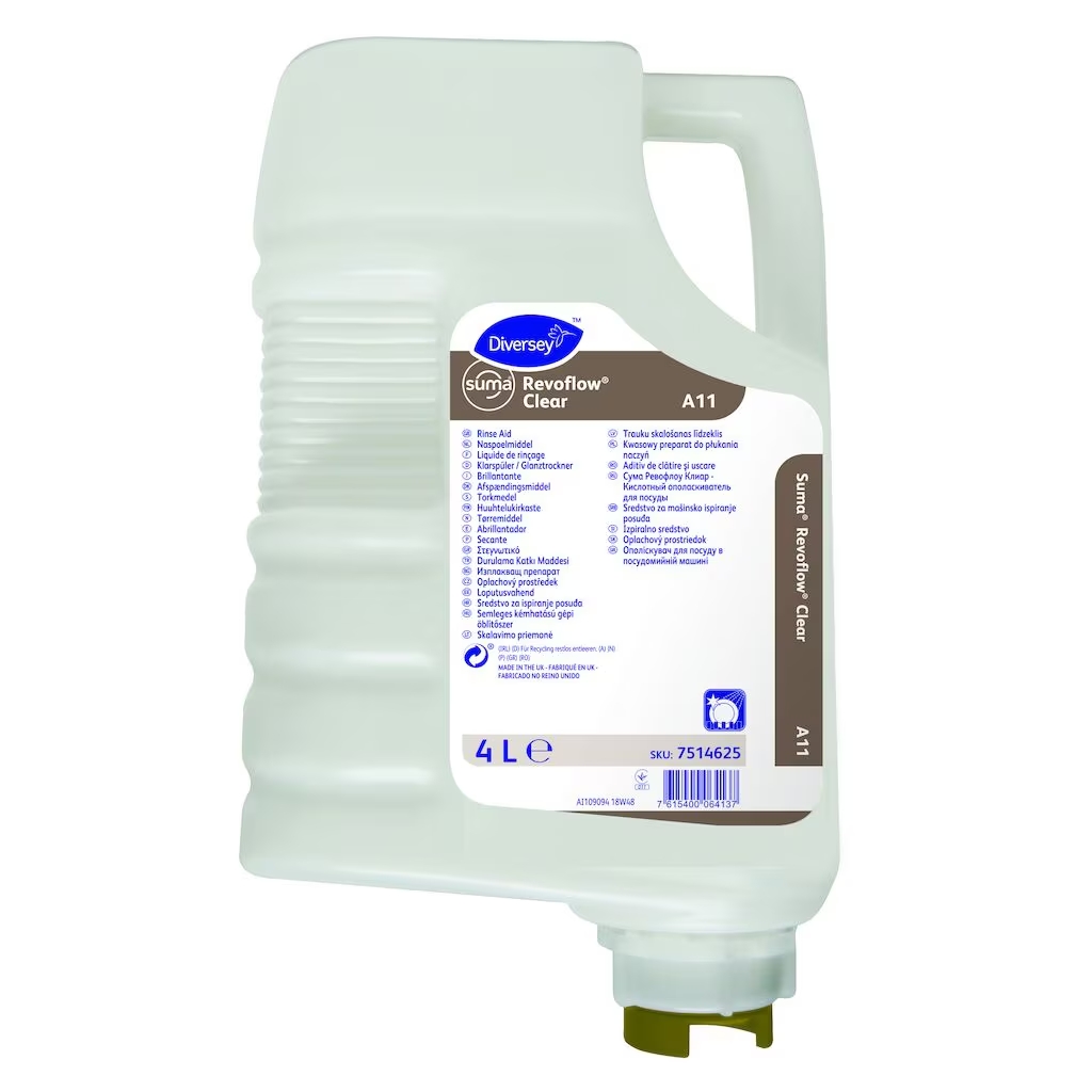 Suma Revoflow Clear A11 è un brillantante concentrato per lavaggio meccanico stoviglie con proprietà di controllo della durezza dell’acqua.