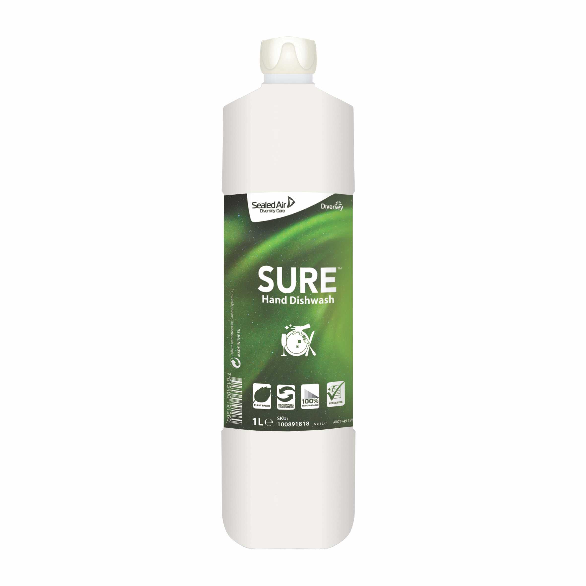 SURE Hand Dishwash fa parte di una linea esclusiva di prodotti professionali per tutte le esigenze di pulizia quotidiana, a base di sostanze vegetali, 100% biodegradabile.